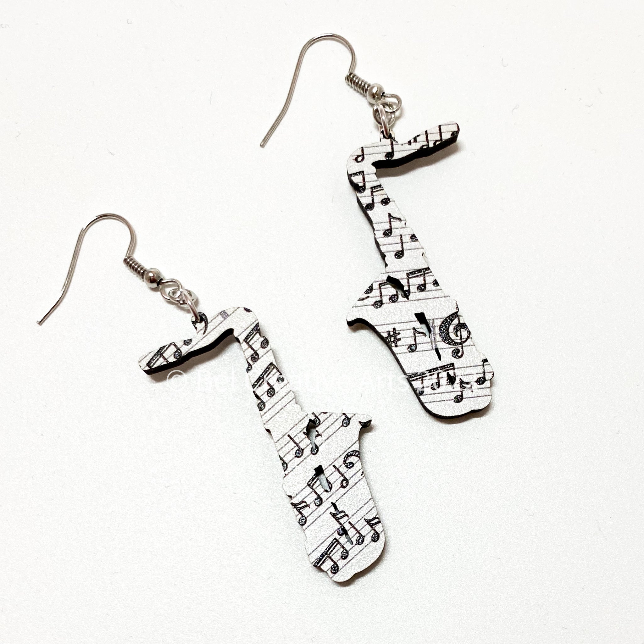 Do you have a saxophone player in your life? These alto sax earrings would make a great gift! The black and white earrings are lightweight, dangling from silver-tone ear wires. Look closely and you will see that each earring is covered in a miniature sheet music pattern on both the fronts and the backs of the earrings.