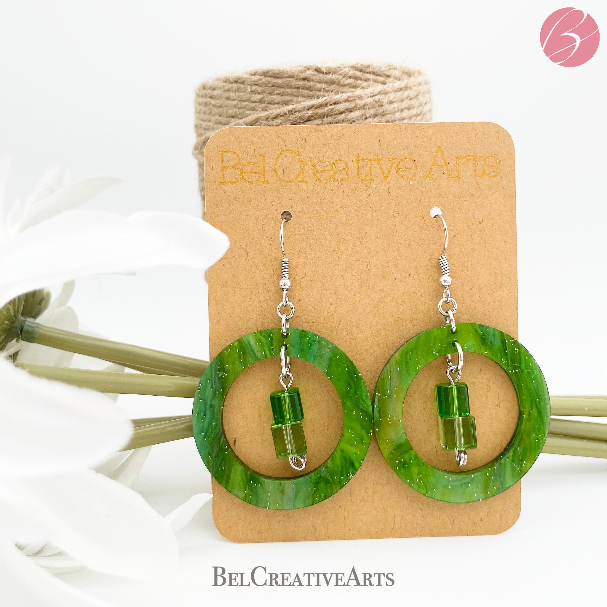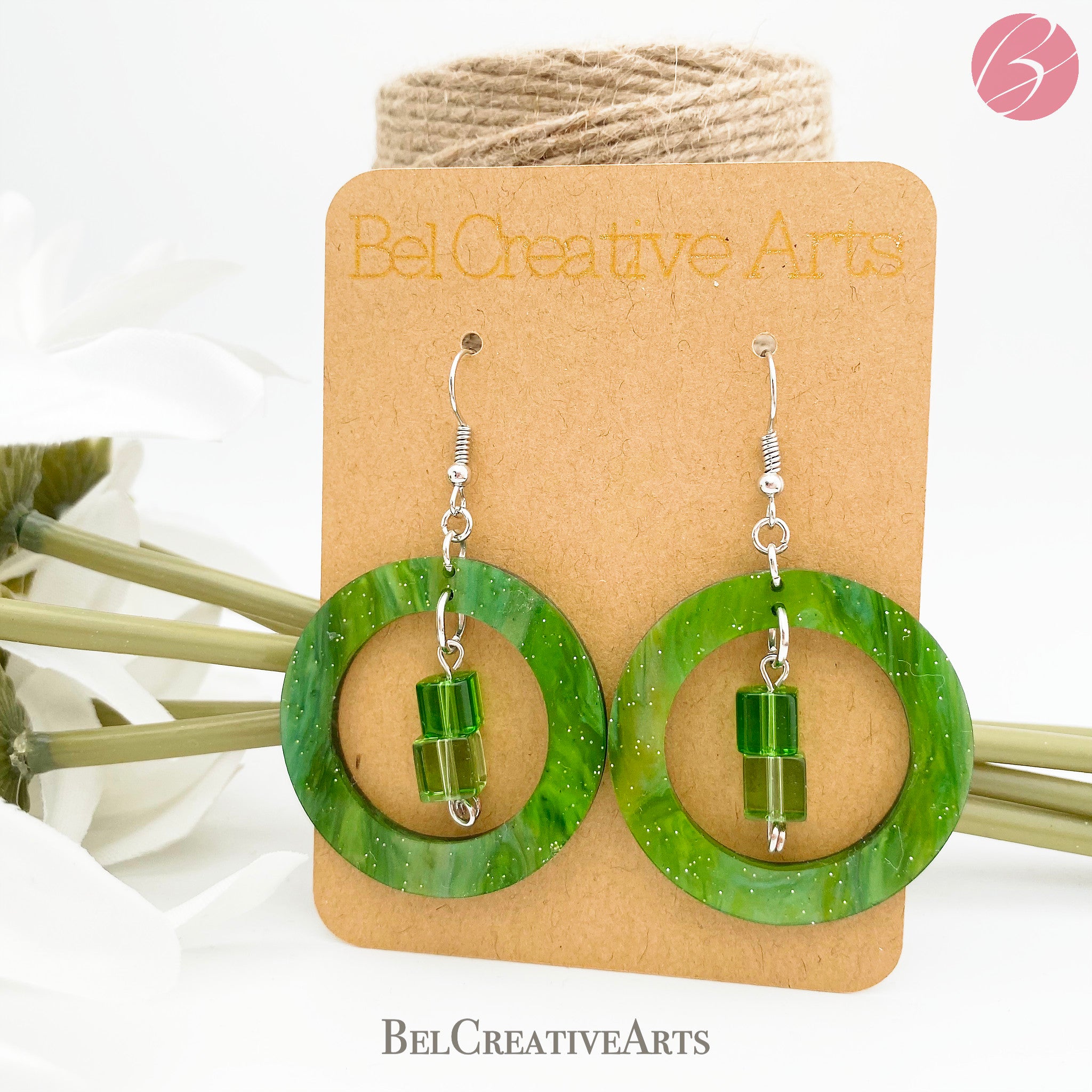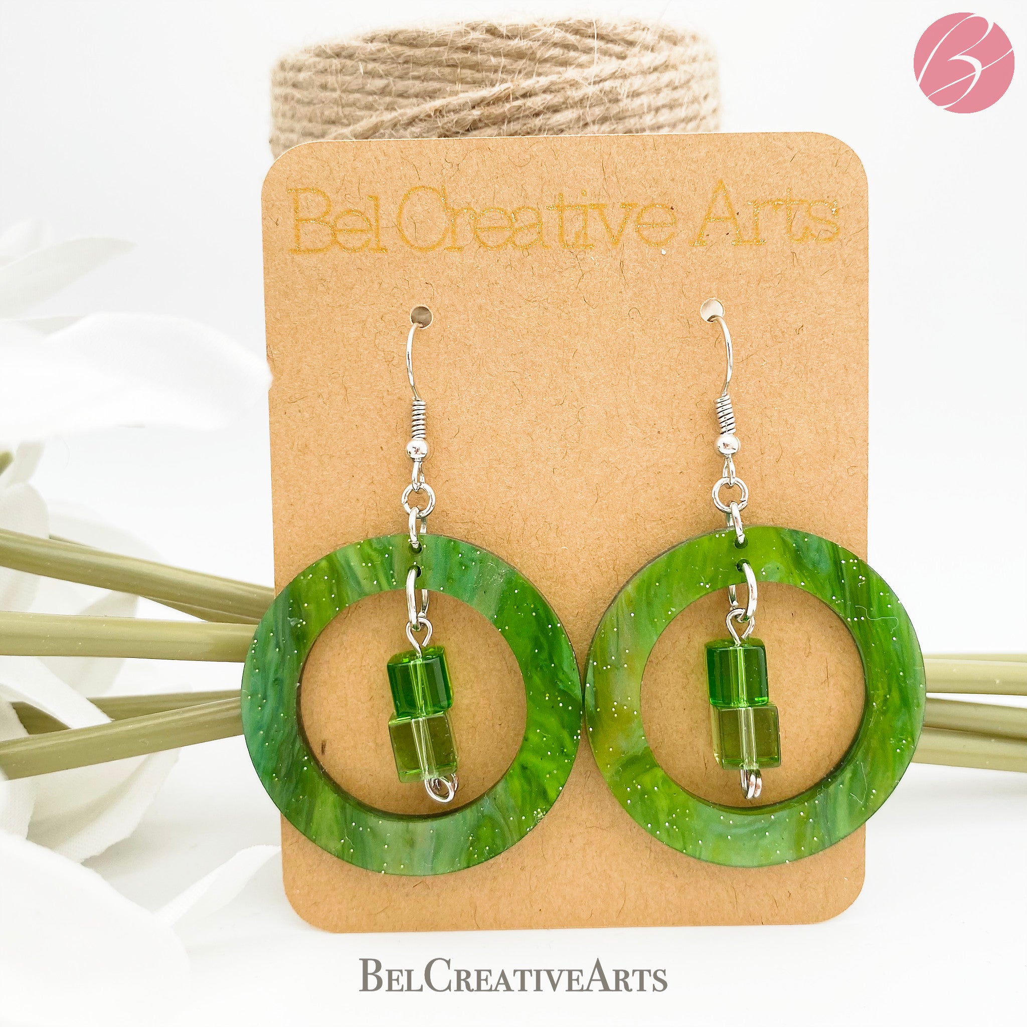 Style: green earrings, geometric earrings, circle earrings, glitter earrings, beaded earrings, dangly earrings, drop earrings, handmade earrings