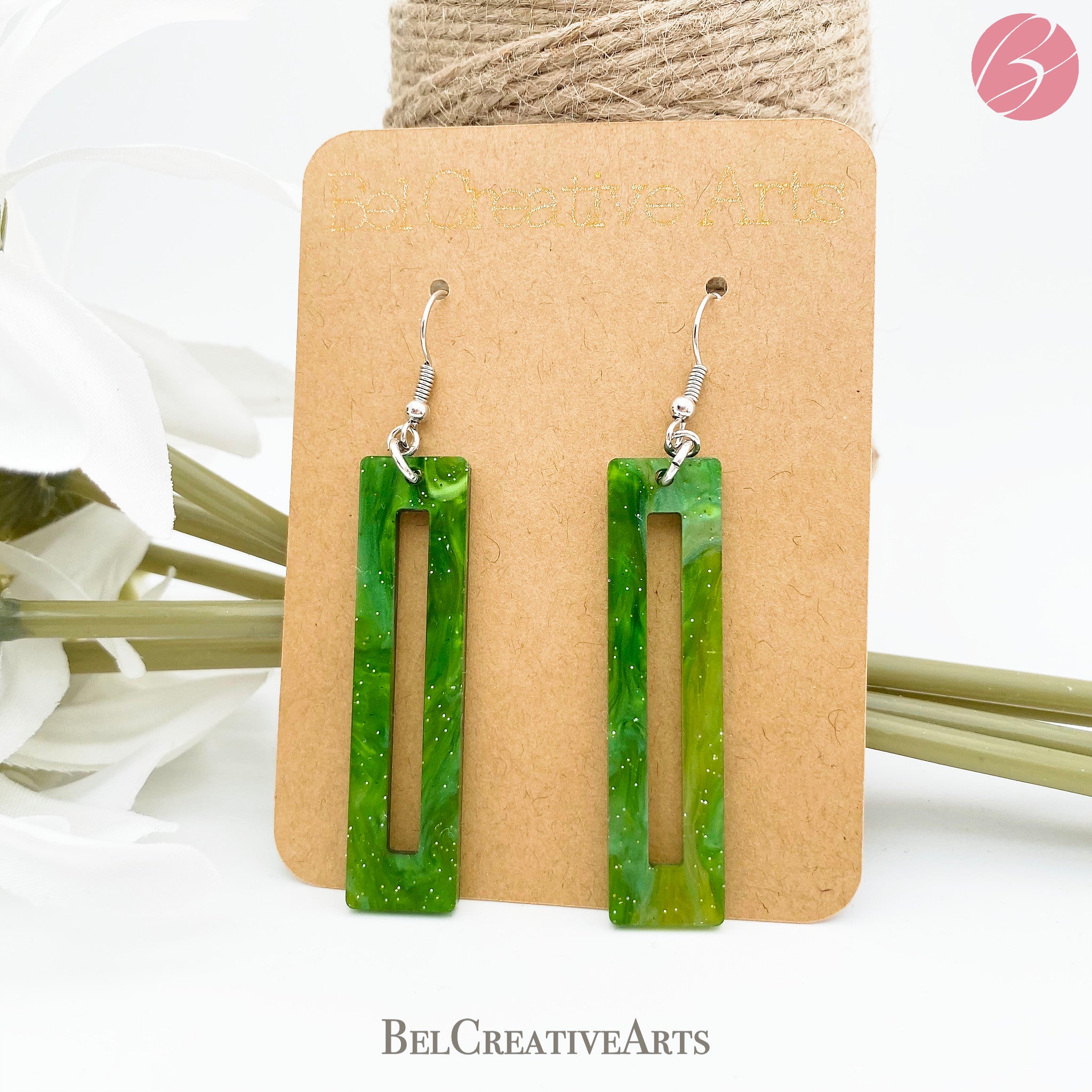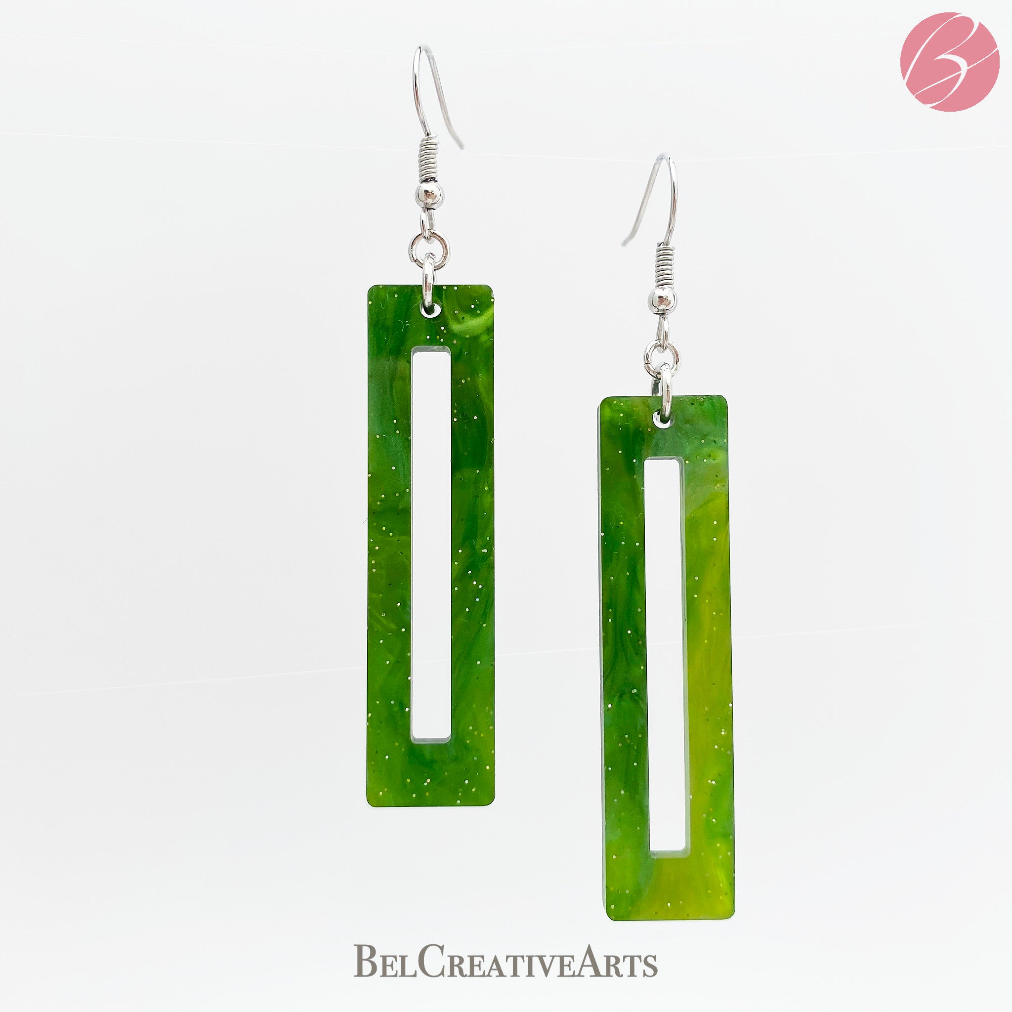 Geometric rectangular bar dangly drop earrings made from semi-translucent marbled green acrylic infused with a touch of glitter. These earrings are incredibly light, but they are full of sparkle and shine. Because the acrylic material is marbled, each pair may have slightly different color variations and will be unique. Includes silver-tone ear wires.