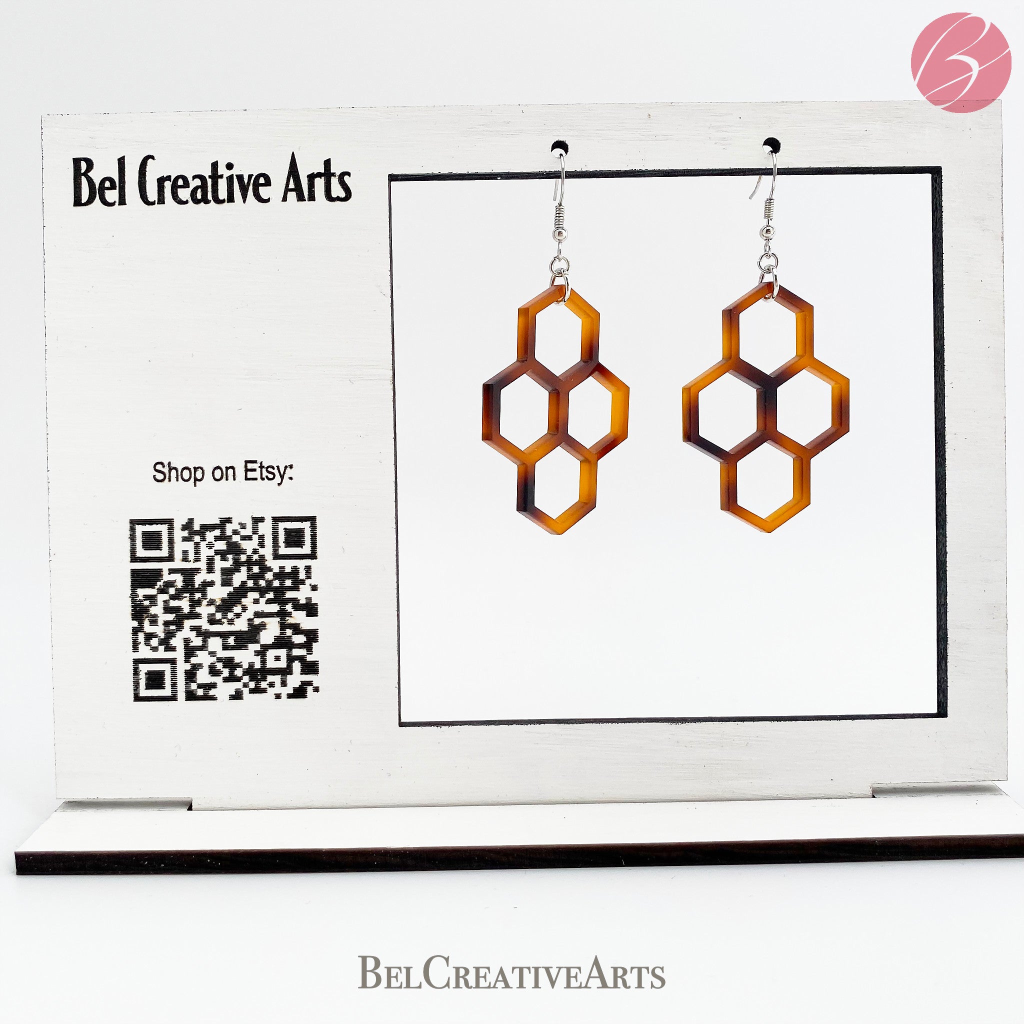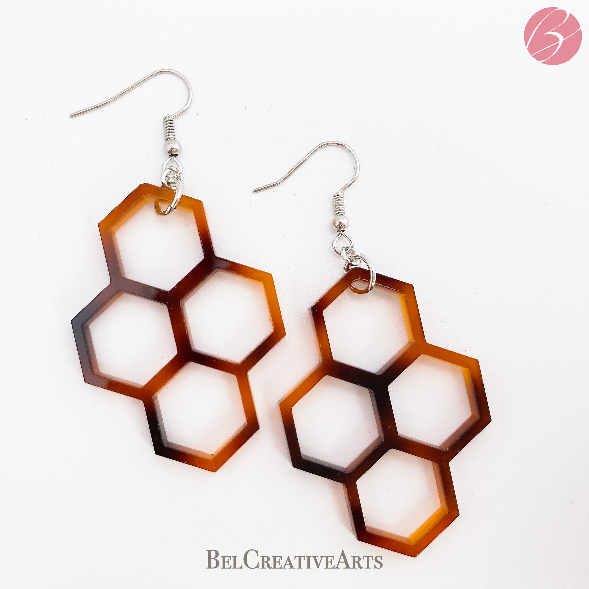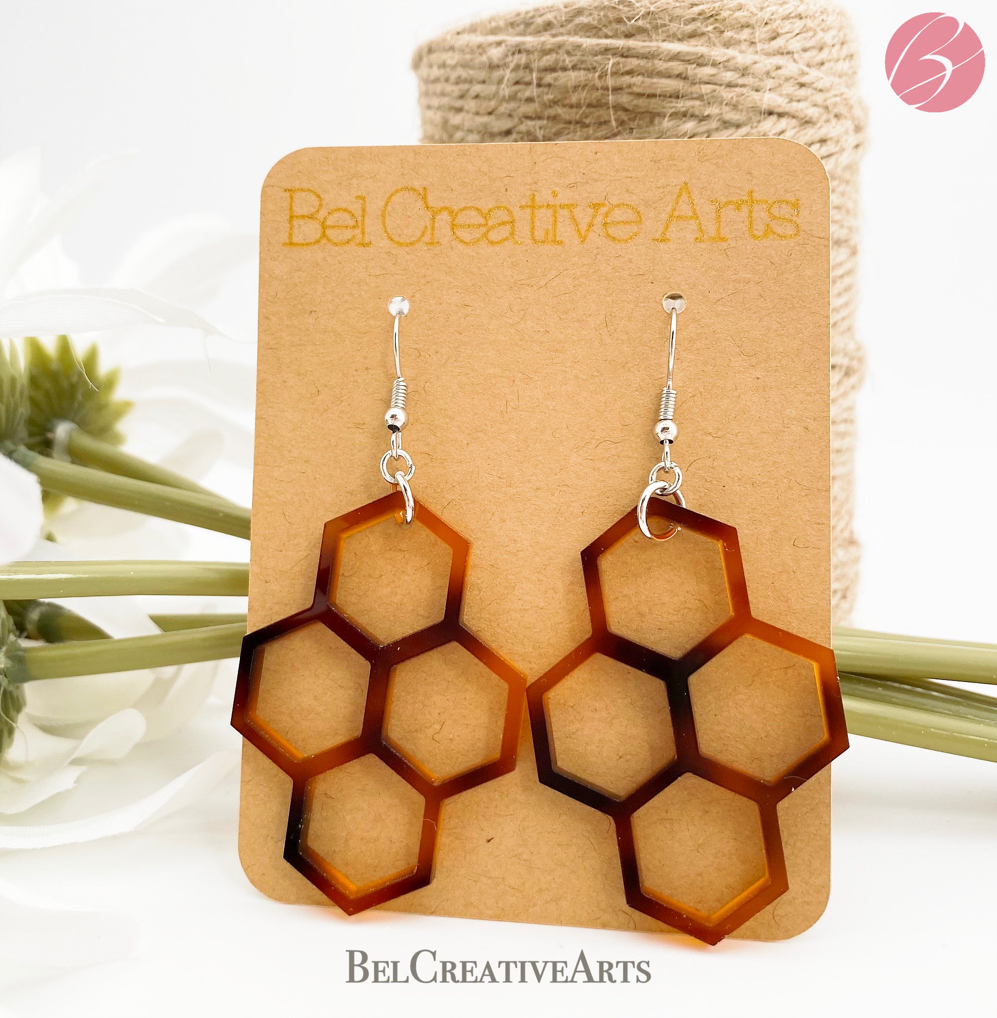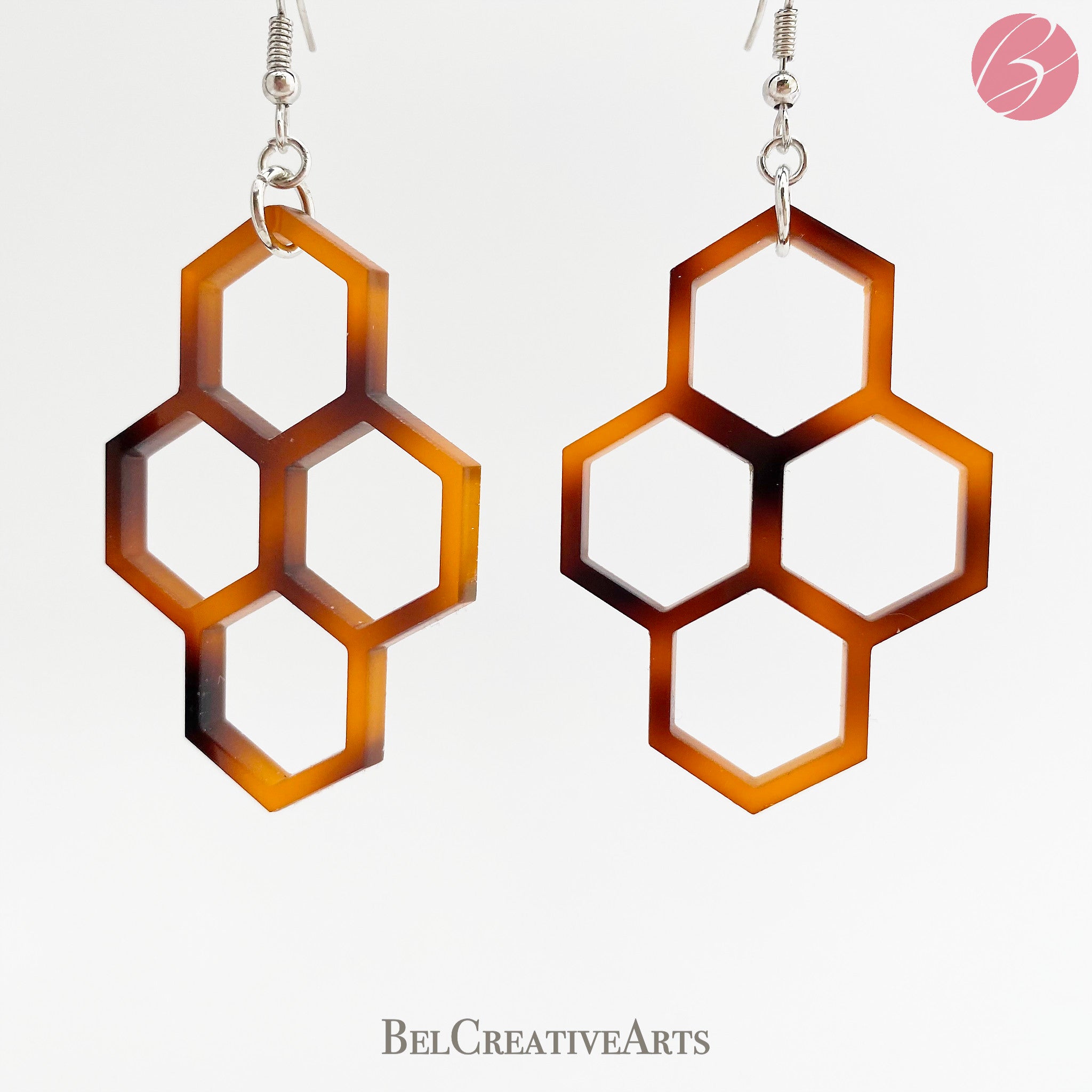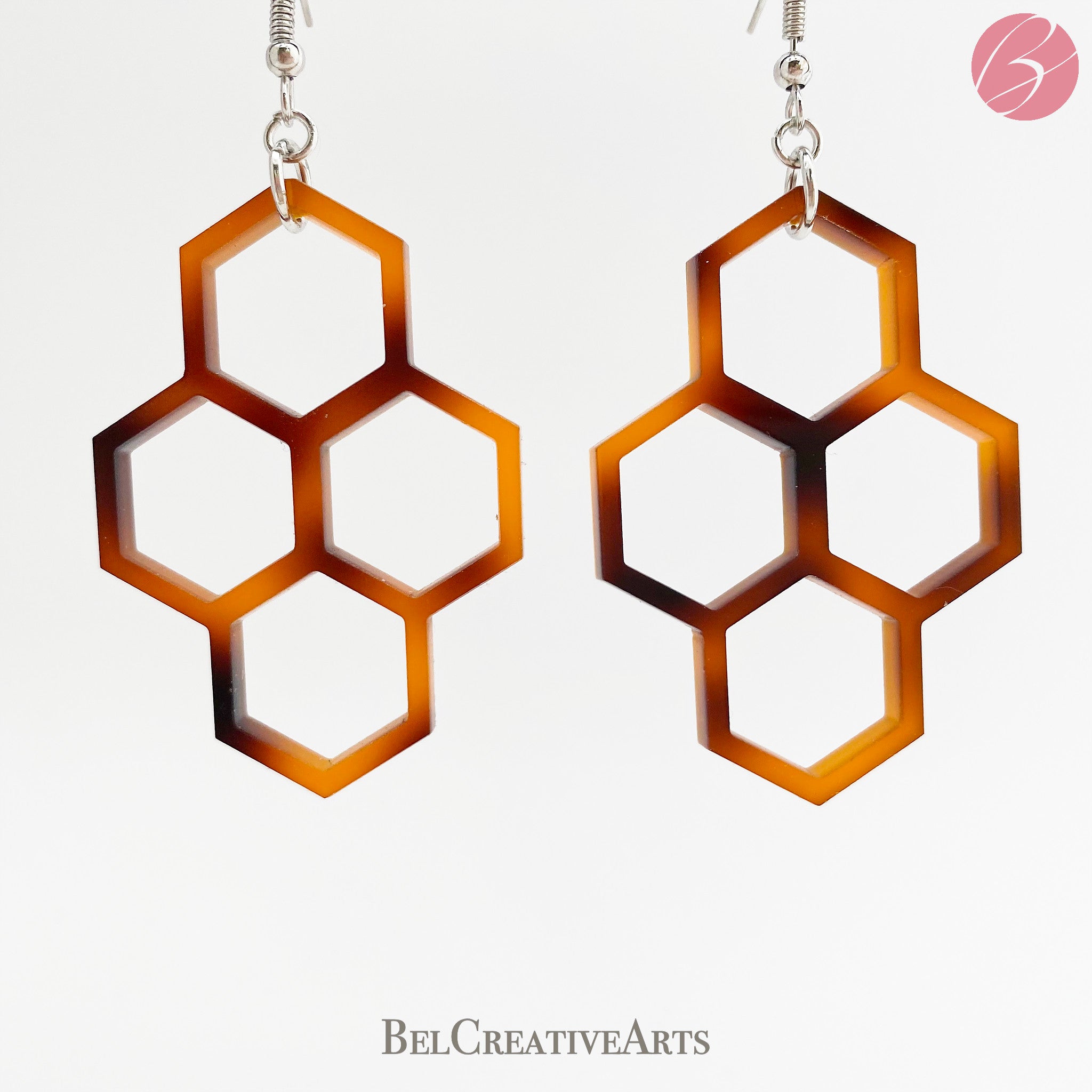 Make a bold statement with these Honeycomb Faux Tortoiseshell Dangle Drop Earrings. Featuring a striking honeycomb geometric design crafted from faux tortoiseshell acrylic, these lightweight earrings are perfect for anyone who loves modern, geometric accessories. The unique honeycomb pattern combined with the rich tones of tortoiseshell makes these earrings both elegant and versatile, ideal for dressing up or down.