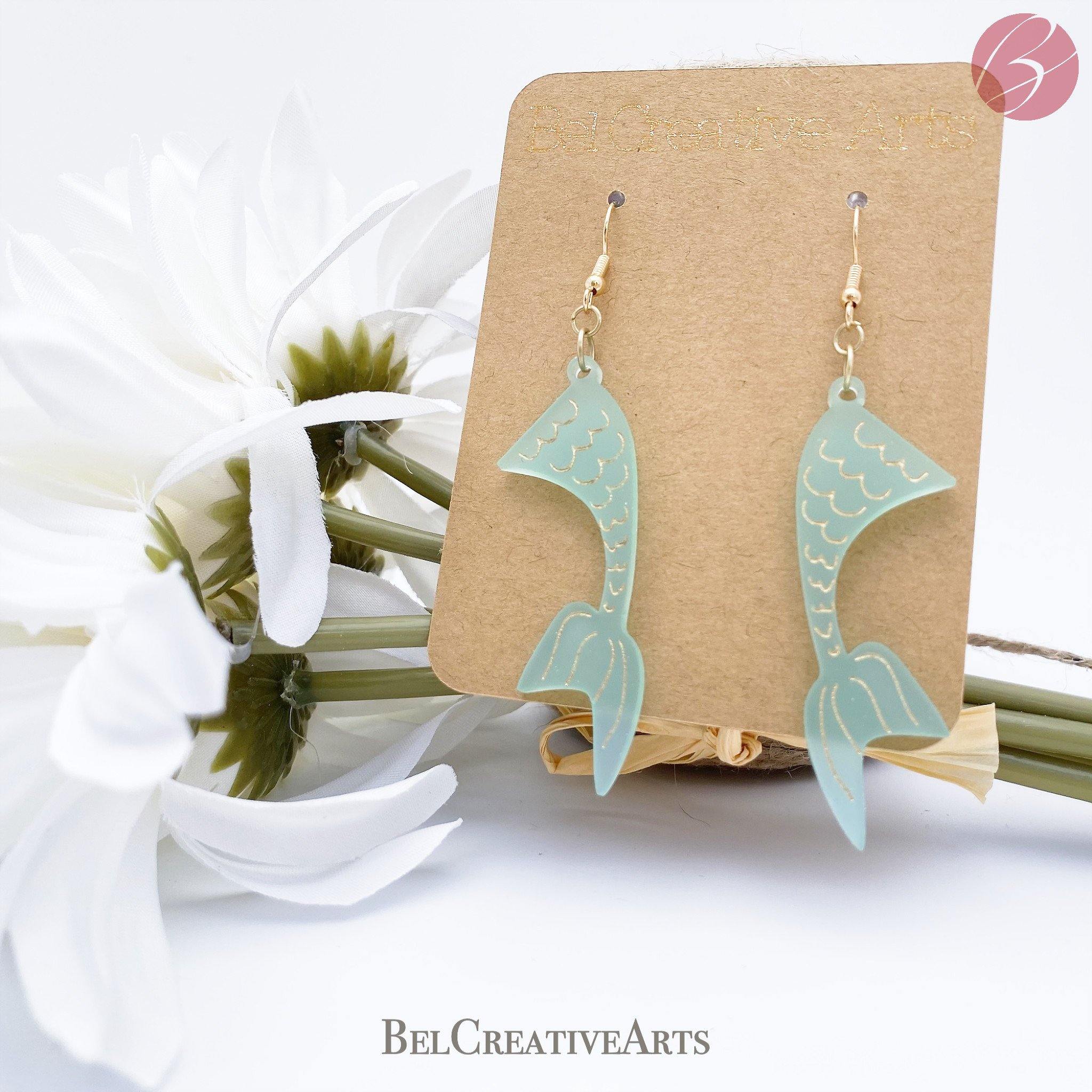 Lightweight dangling drop earrings made of translucent frosted green acrylic with gold-filled engraved details. As the earrings move, they catch the light and shimmer like weathered sea glass.