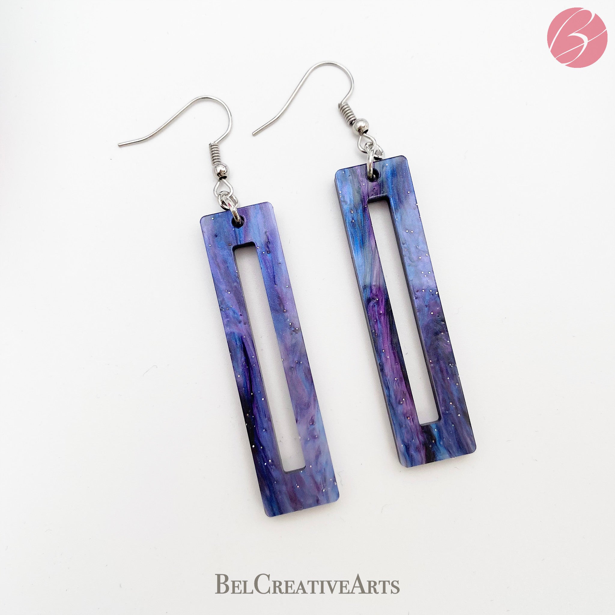 Inspired by space, these rectangular geometric earrings are made from semi-translucent marbled purple and blue acrylic infused with a touch of glitter. These earrings are incredibly light, but they really sparkle and shine in the light. Because the acrylic material is marbled, each pair may have slightly different color variations and will be unique. Includes silver-tone ear wires.